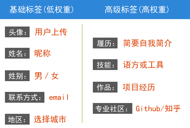 第一,將目標用戶標簽化,并為各個標簽標示權重高低。標簽化是為了后期的數據統計分析;標示權重高低則是為了突出某些特定的產品功能和模塊,也為了劃分用戶質量高低,高權重標簽對于用戶的 Rank 排名有非常大的影響。